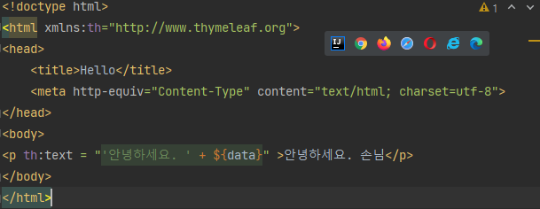 - <html xmlns:th = "http://www.thymeleaf.org"> 를 써주면 해당 html 파일 내에서 thymeleaf를 사용할 수 있습니다.